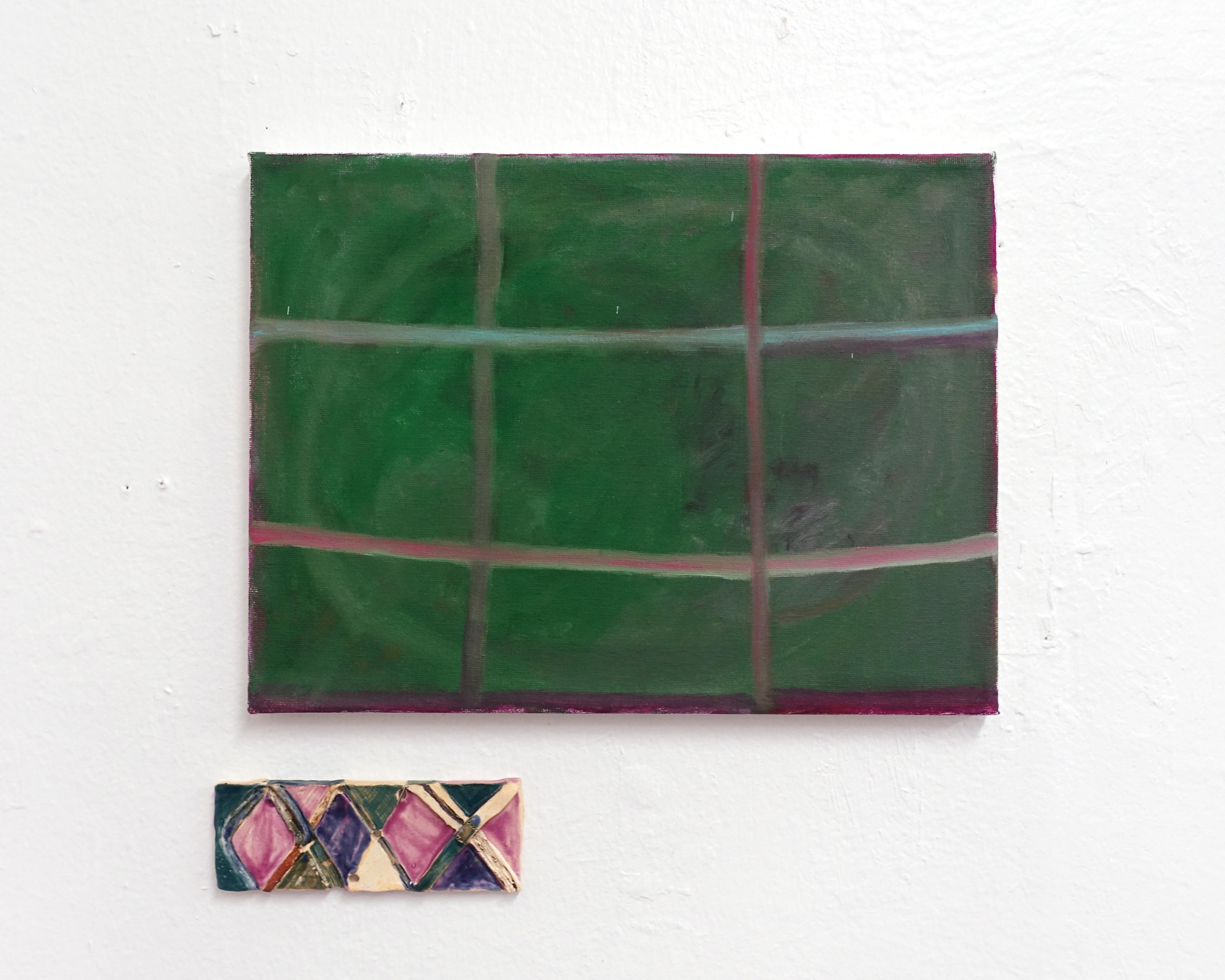 Oil on canvas with ceramic and ribbon